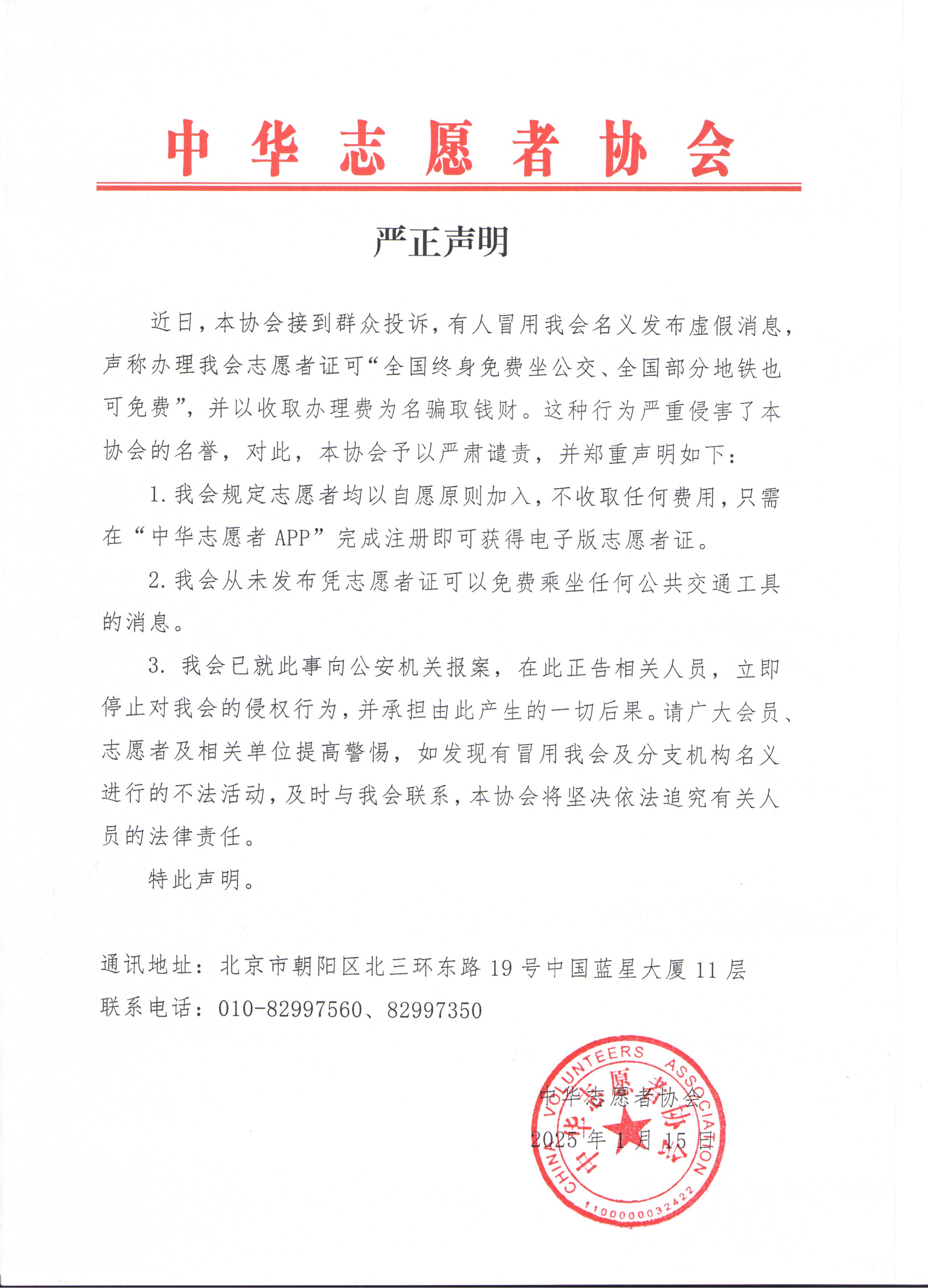 近日,本协会接到群众投诉,有人冒用我会名义发布虚假消息,声称办理我会志愿者证可“全国终身免费坐公交、全国部分地铁也可免费”,并以收取办理费为名骗取钱财。这种行为严重侵害了本协会的名誉,对此,本协会予以严肃谴责,并郑重声明如下: